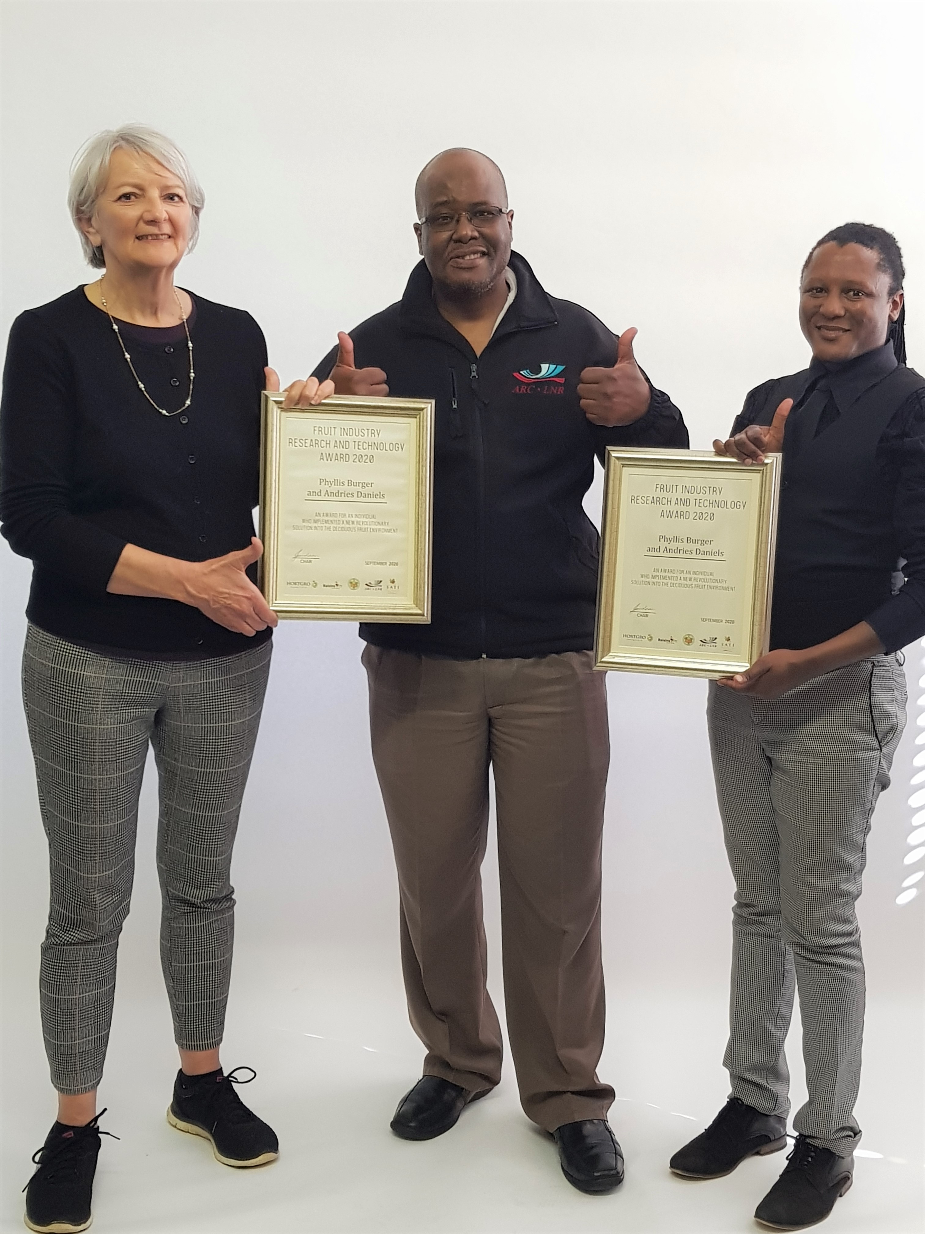 Stellenbosch: The Agricultural Research Council (ARC) is proud to announce that Ms Phyllis Burger and Mr Andries Daniels from ARC Infruitec-Nietvoorbij received the Deciduous Fruit Industry (DFI) merit award for Research and Technology.