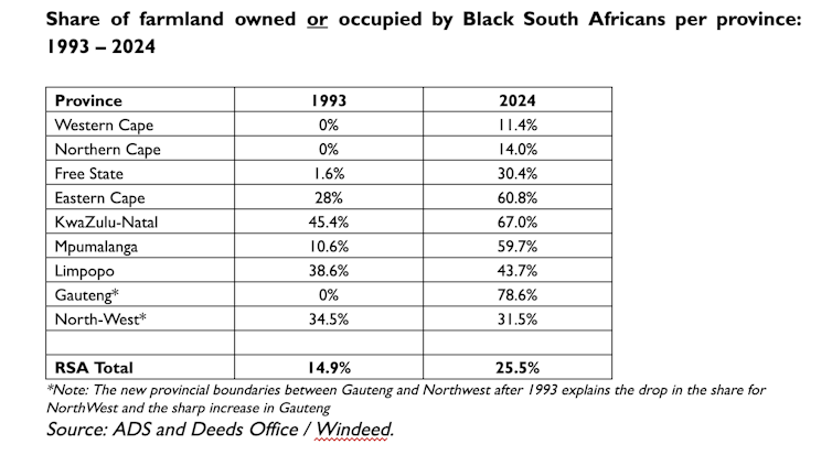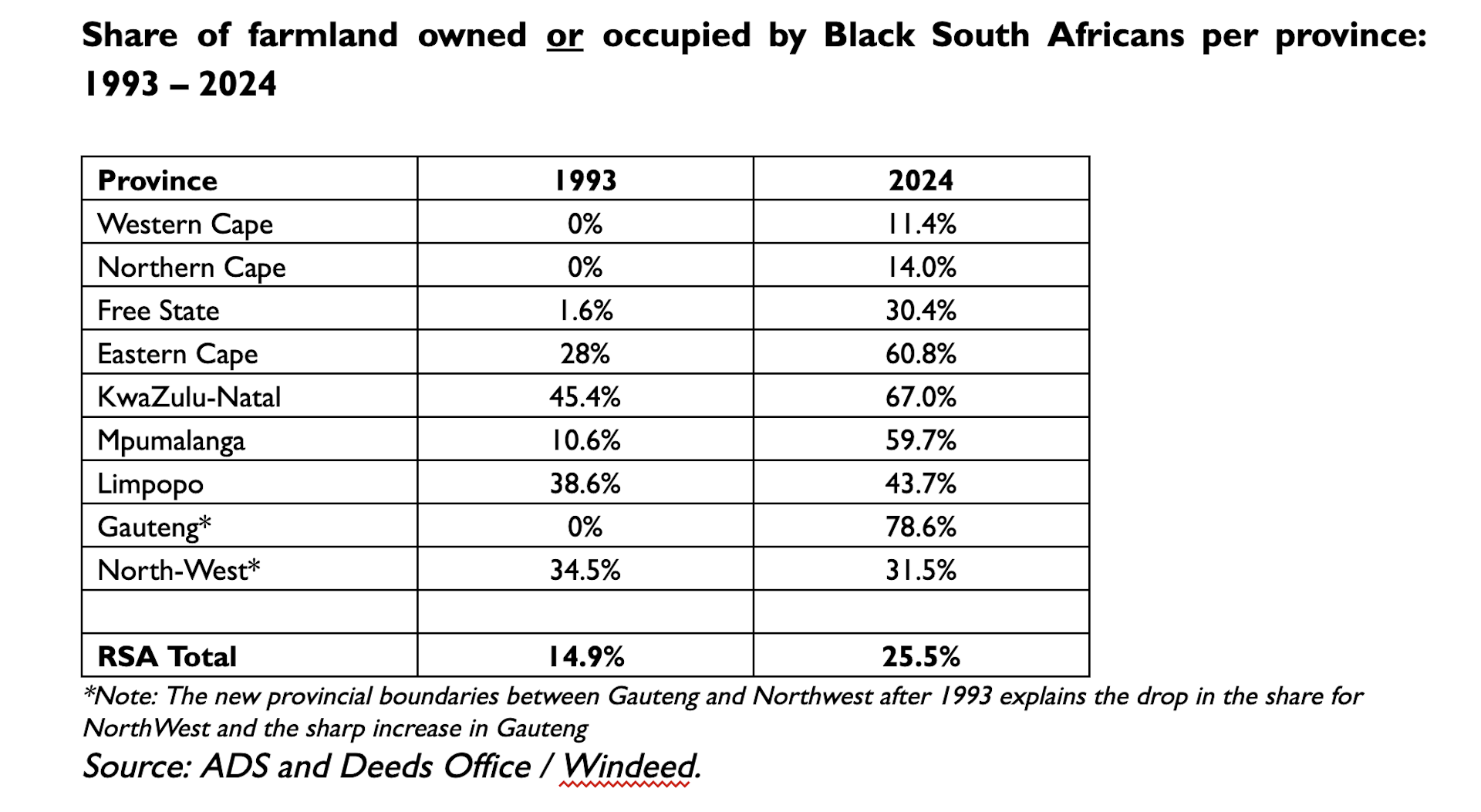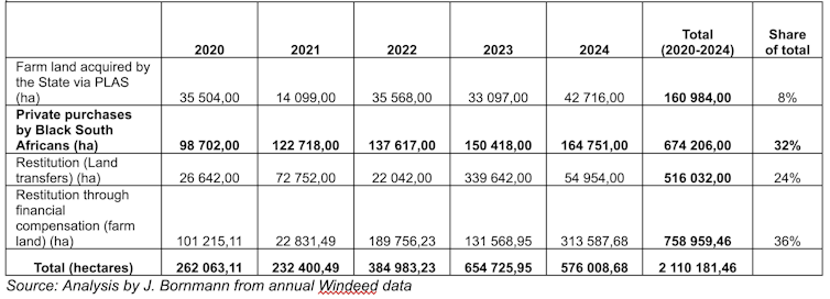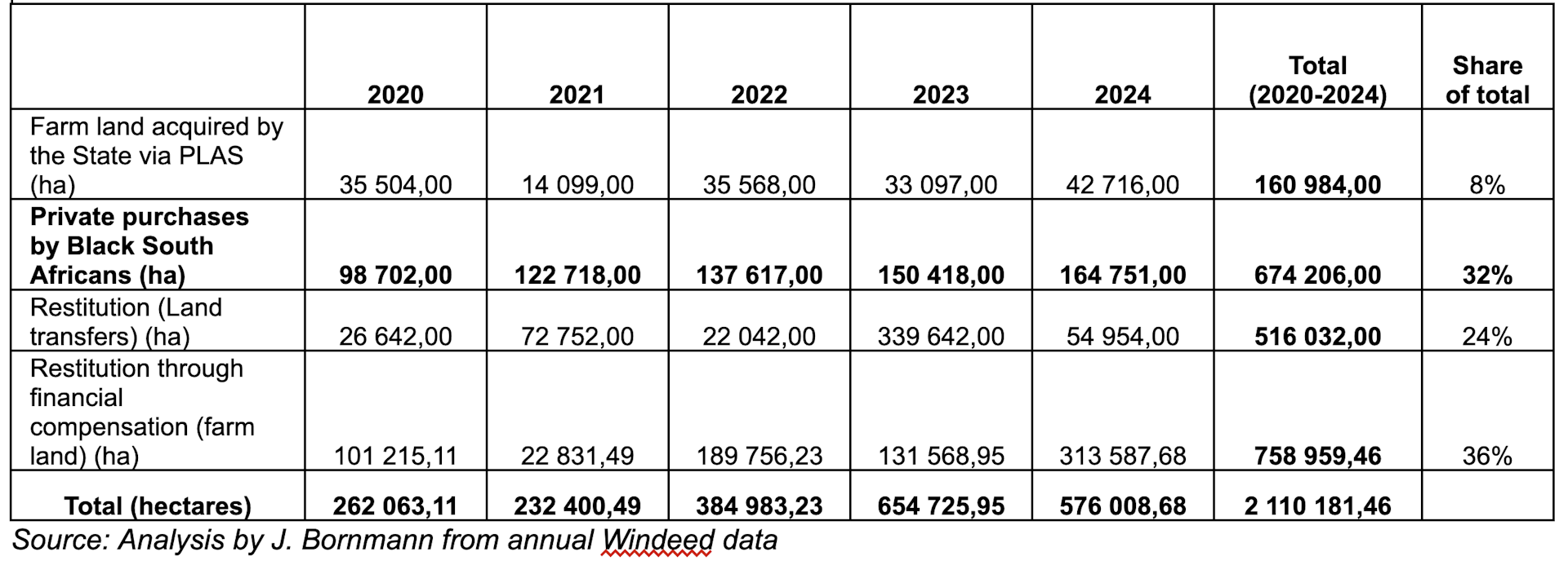 Included in the total of 19.5 million hectares are private purchases of farm land by black South Africans. We estimate a total of 2.4 million hectares have been acquired in this way up to the end of 2024.