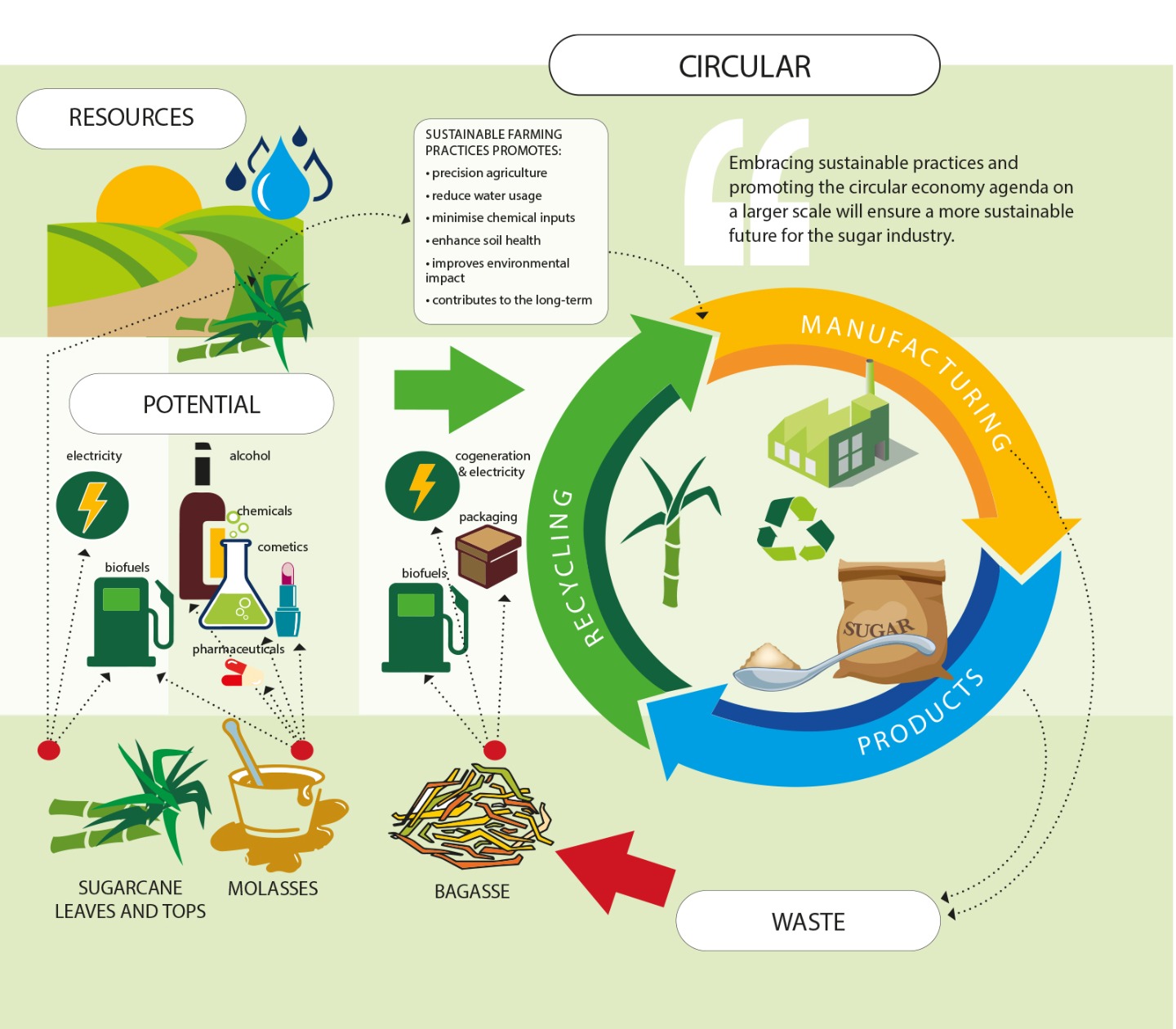 In recent years, the concept of a circular economy has emerged as a revolutionary solution to reduce waste and create value from it. Given the valuable biomass by-products that come from the sugar production process such as bagasse, tops and trash, the South African sugar sector has the potential to harness this circular economy approach for positive change and sustainable growth. It can achieve this by beneficiating its waste to generate a variety of products ranging from bioenergy, second-generation biofuels, animal feed and bioplastics.