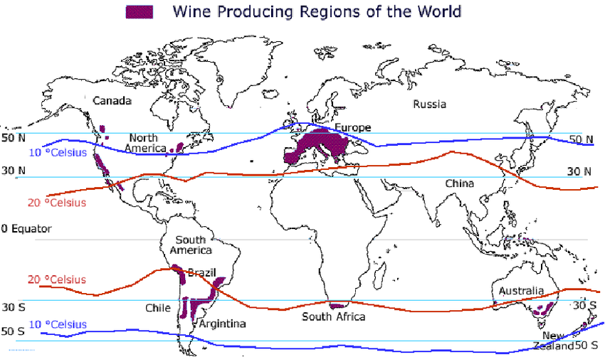 Most of the grapes for wine production are grown in climates located between the 30th and 50th parallel on the northern and southern hemisphere.