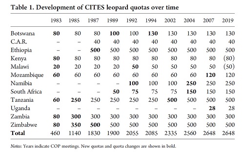 Editorial note: Many countries do not make use of their full CITES export quotas. For example, South Africa has access to a CITES export quota of 150 leopards (see table below), but in 2018 permitted a quota of seven leopards.
