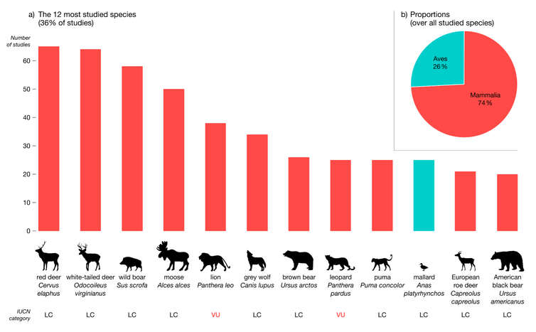 The 12 most-studied species in recreational-hunting research (a), and the percentage of studies dedicated to mammals and birds (b). IUCN Red List (iucnredlist.org) threat status: LC = Least Concern; VU = Vulnerable. One Earth © the authors