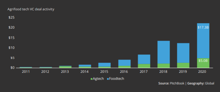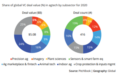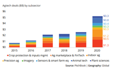 In 2020 AgTech deals had grown to $5 billion (416 deals) up from $1.2 billion (~235 deals). The subsectors of AgTech receiving the lion’s share of the investment, are: