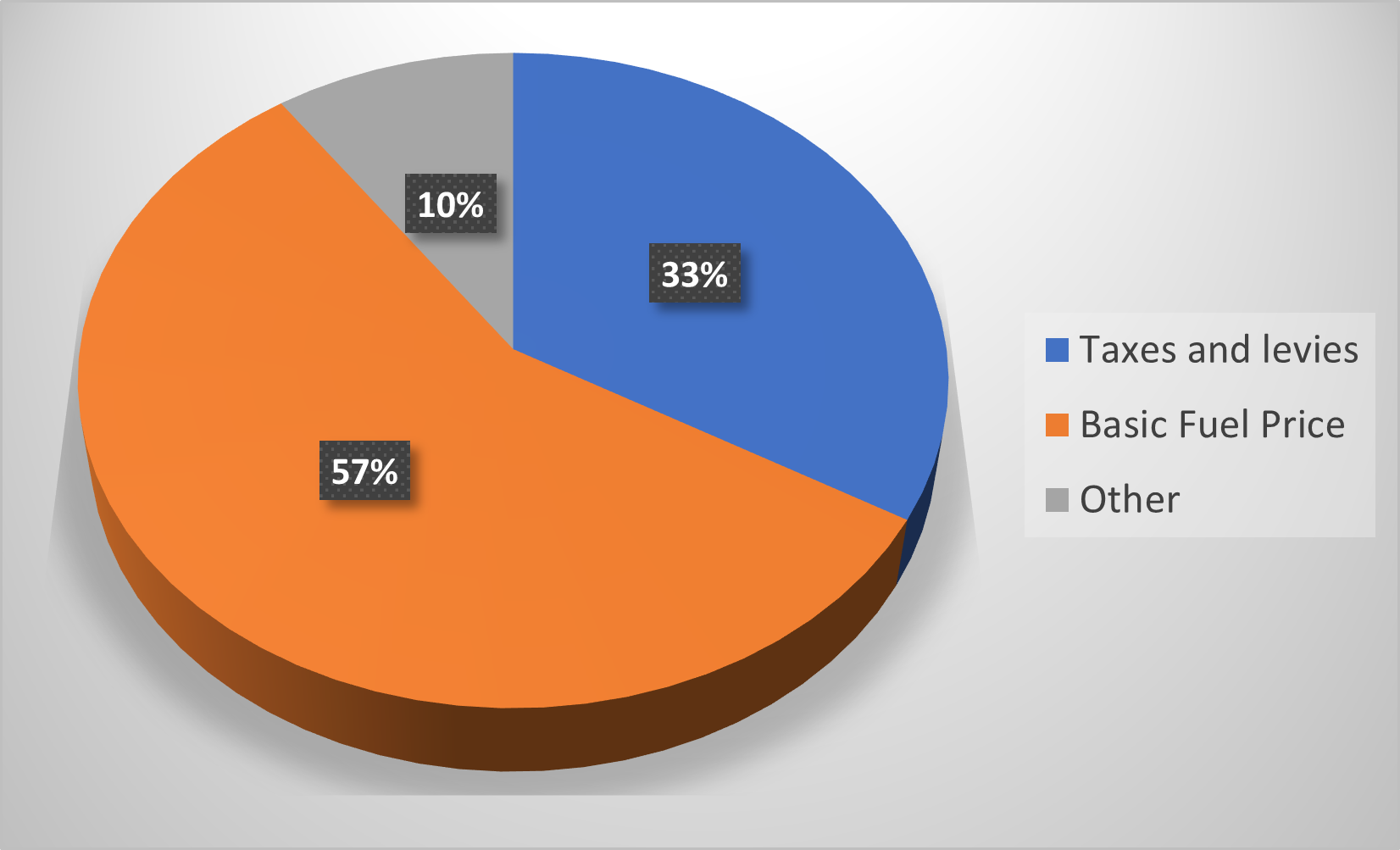 With a basic fuel price of R11,08/L and levies and taxes of R6,50/L, levies and taxes are 59% of the basic fuel price and 33% of the total cost per 1 litre of diesel.