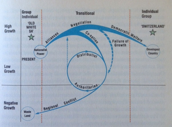 However, more recently, our economy has not performed for all the reasons we know about. We have followed the dotted line of descent entitled ‘Failure of Growth’ and have moved to the left with deep divisions among competing groups once again dominating our society.