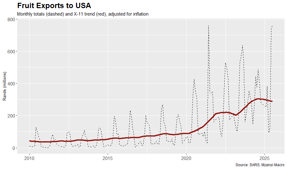 The US has become an increasingly important market for the local fruit industry, with exports increasing six-fold over the last 15 years, from just R50 million per month in 2010, to just under R300 million in 2024 (in real terms, adjusted for inflation). The US only used to make up 2% of total fruit exports in the 2010’s, which has doubled to 4% in the 2020’s. South Africa mainly exports citrus, grapes and apples to the US, and recently had its best month on record in July, exporting R764 million of fruit to the US, apparently due to a bumper citrus crop, and exports for the year to date are up 20.2%.