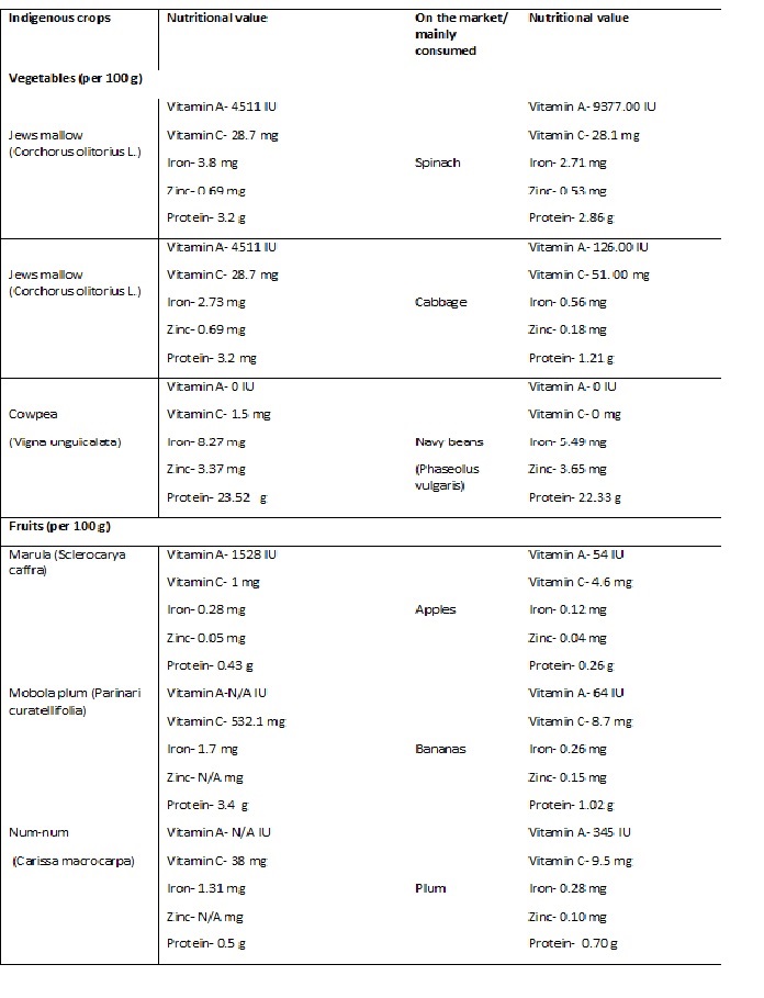 Thousands of South African’s diet is dominated by staple foods such as maize meal and bread, mostly containing macronutrients resulting in low dietary diversity. This results in an increase in micro-nutrient deficiency-induced diseases such as anemia which is associated with insufficient Vitamin A and Zinc. A study by Pretorius & Schonfeldt found out that instead of a mean vitamin A concentration in maize meal of ≥ 187.7 µg/100 g, products in the markets ranged from < 19 µg/100 g to 261 µg/100 g. In addition to this problem, vegetables and fruits with high nutrition such as broccoli, Swiss chard, asparagus, avocado, grapefruit, pineapple and blueberries are often highly-priced and out of budget for the majority of the population. The key challenges facing fruits and vegetables industry include water shortages and land expropriation. Therefore, an alternative will be to increase consumption of affordable indigenous vegetables, fruits and grain.